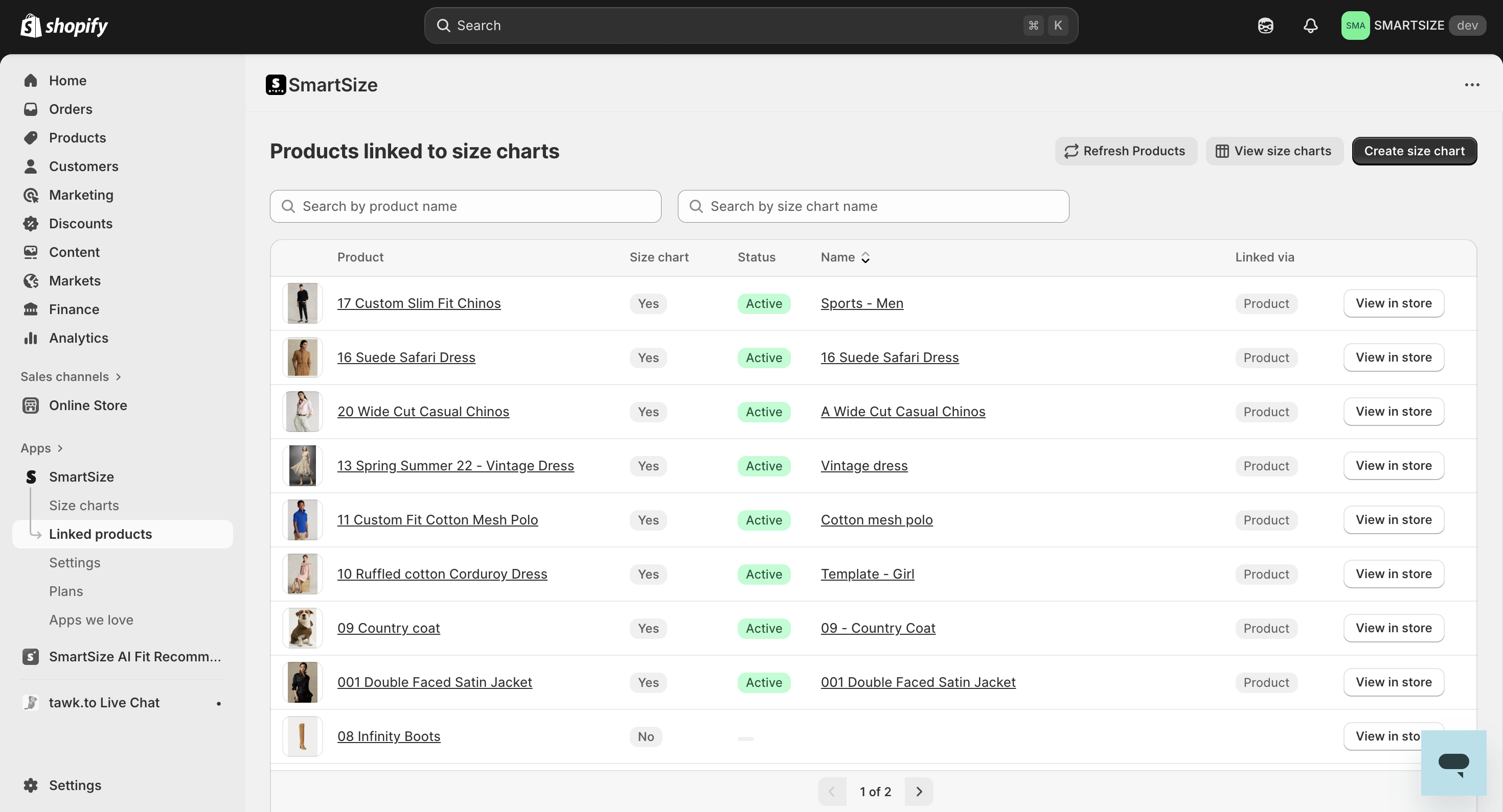 - Important: Click on 'Refresh Products' to view your latest changes. If you have many products, this could take a couple of minutes. You can continue doing something else in SmartSize during this time and come back once it is done.