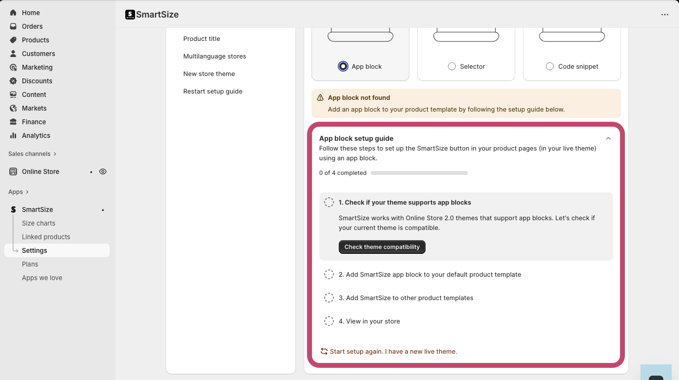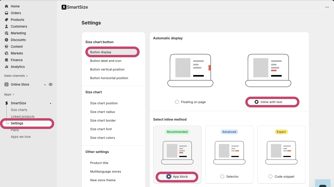 Important: Some themes do not support App Blocks. If your theme is incompatible, you will need to add the SmartSize button manually.