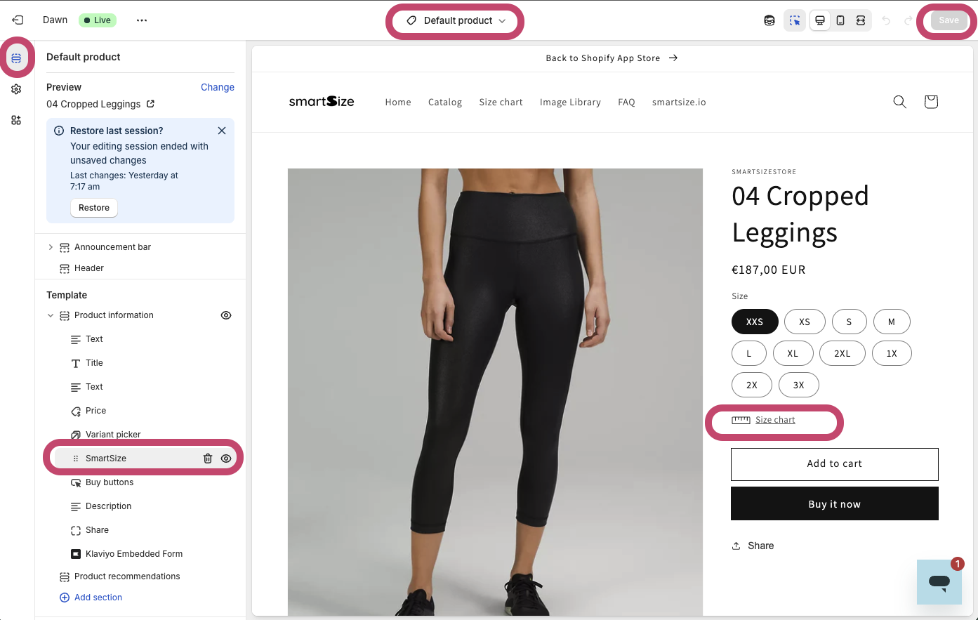 - Under the left menu, find 'Product information' section and click on the (+) icon to add a new app block, select SmartSize