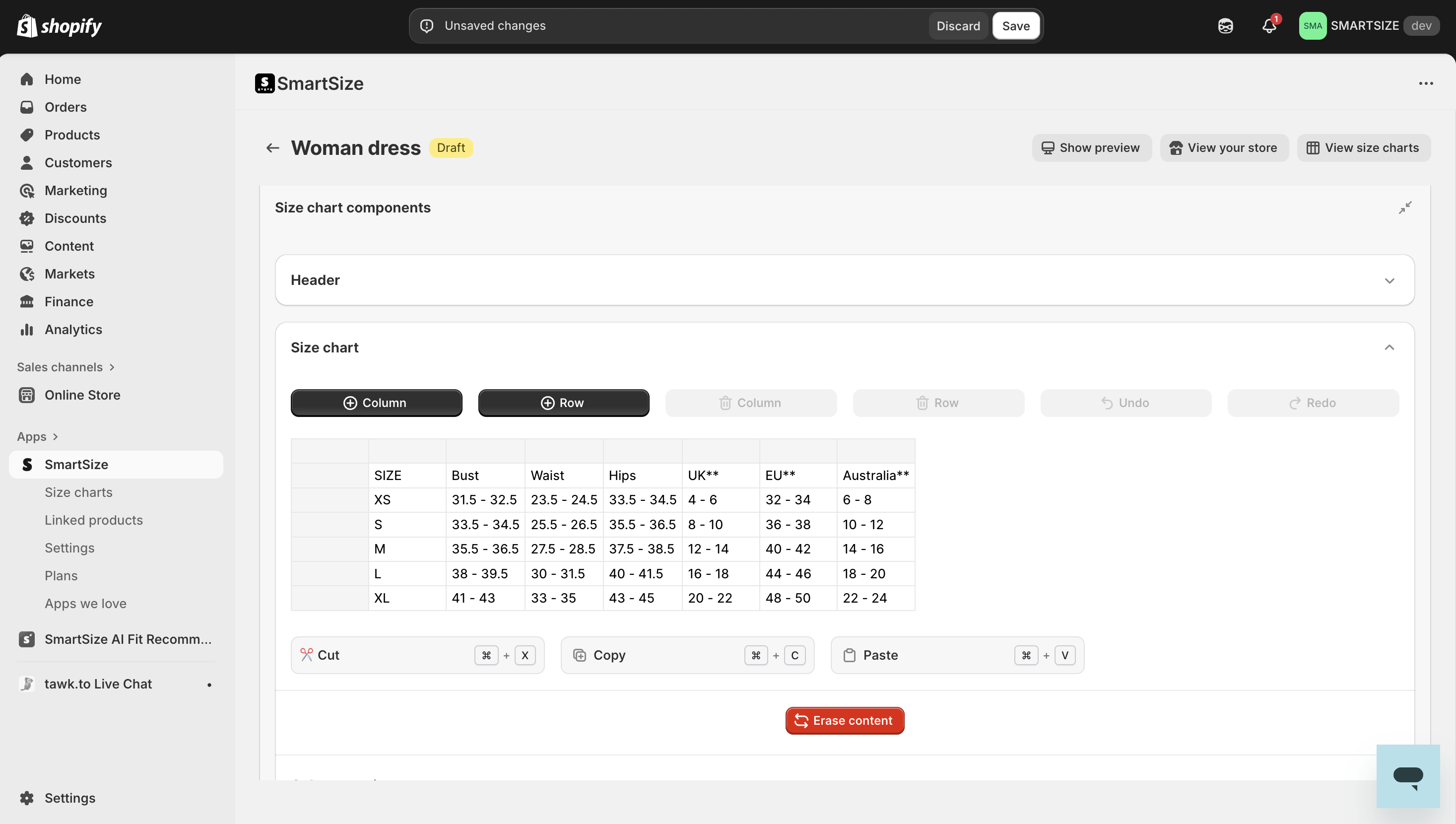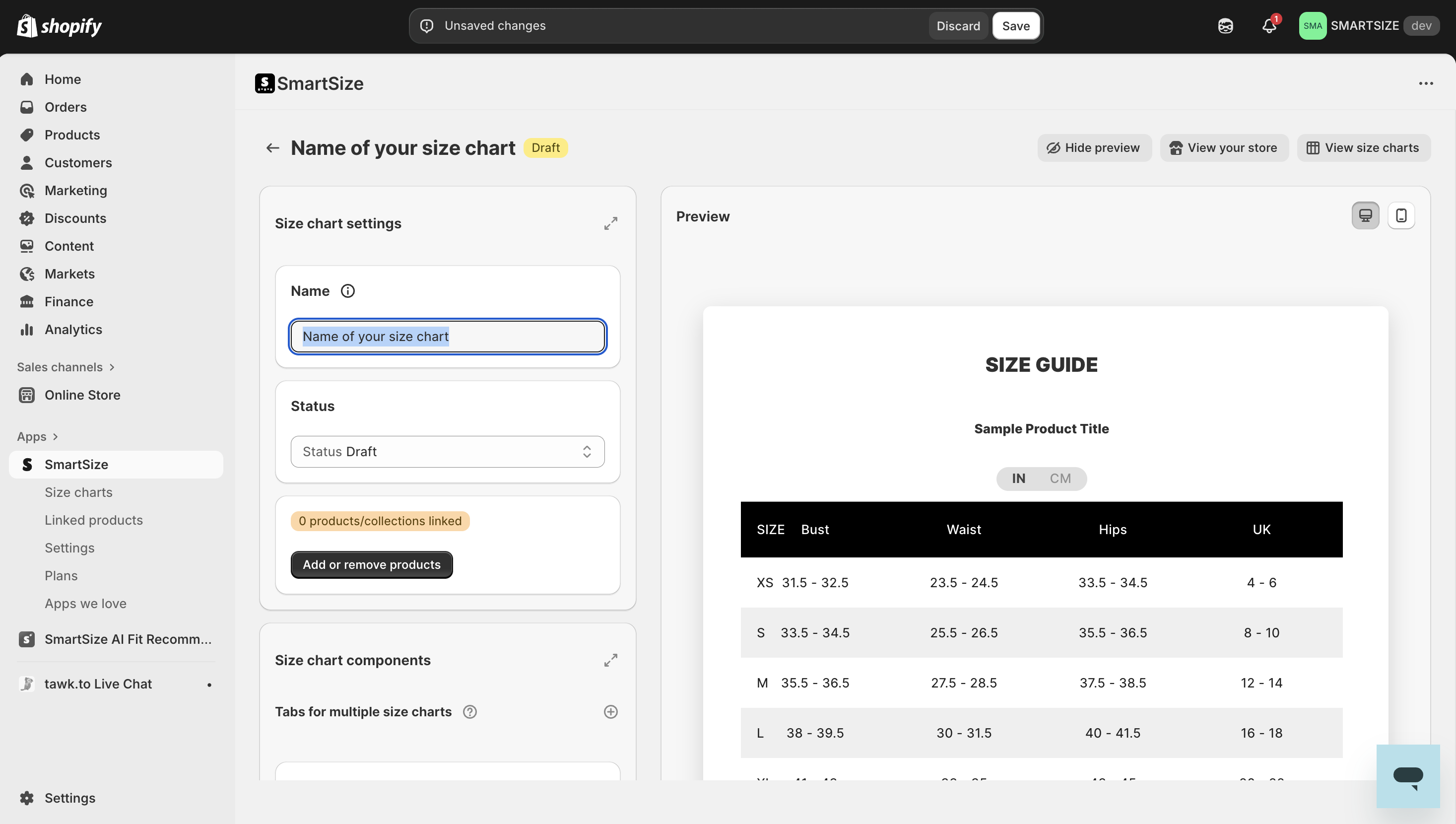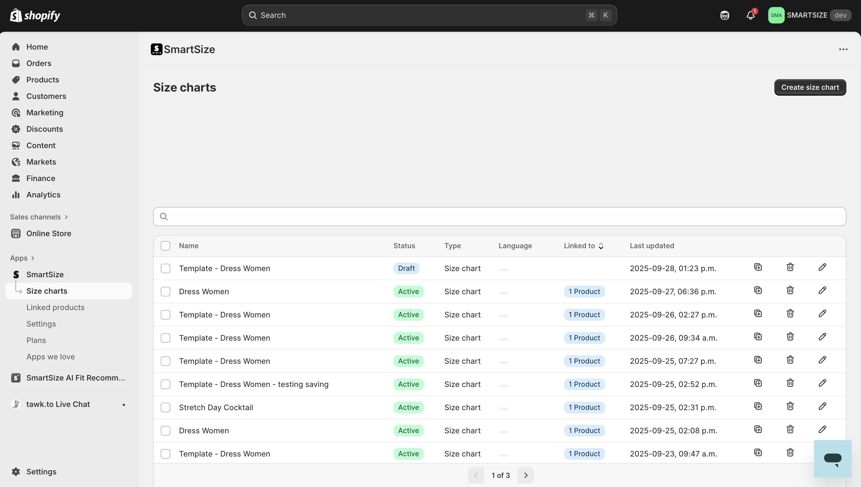 In your Shopify admin, go to Apps → SmartSize → Size Charts.
