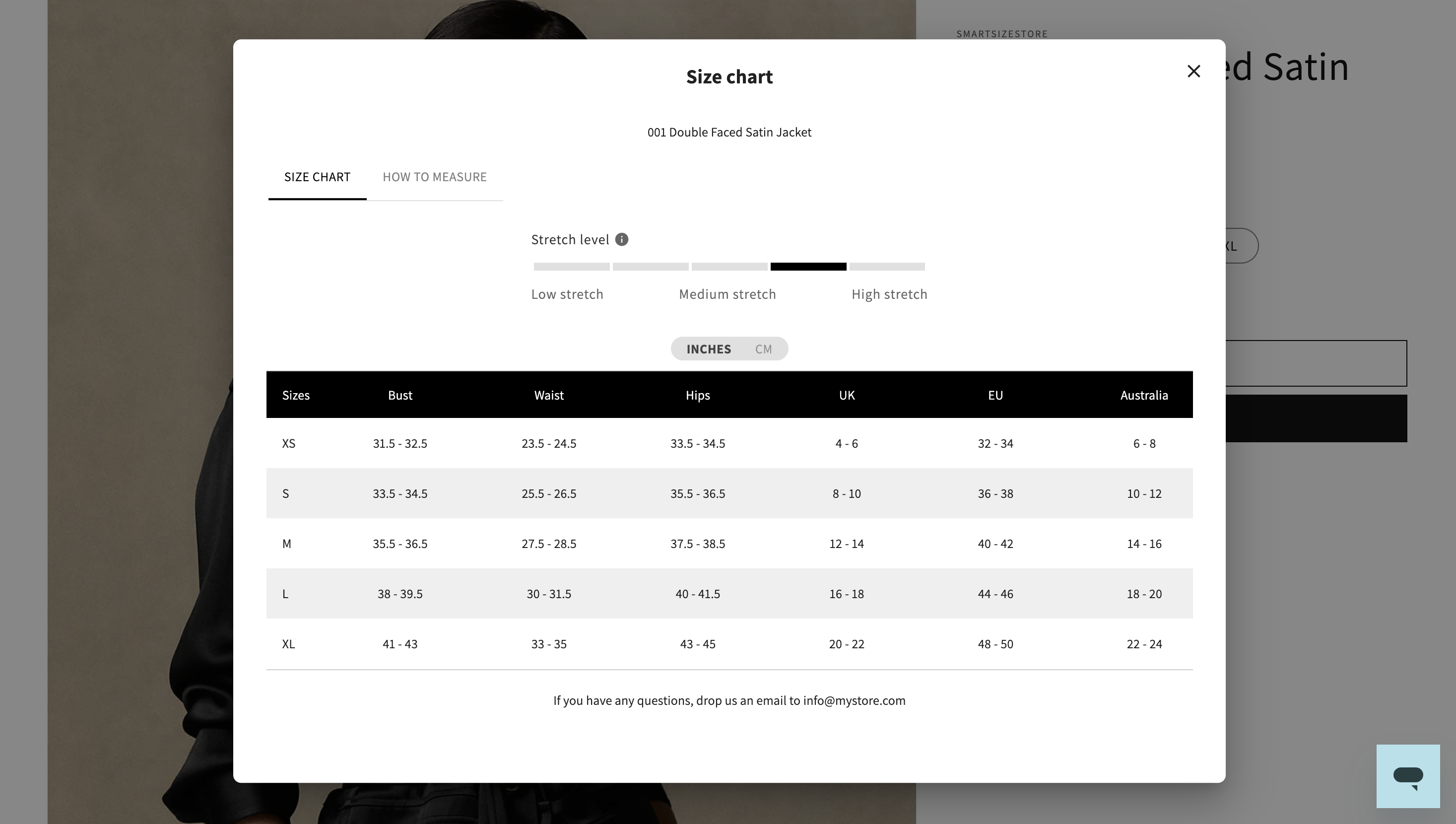 Use the Fit scale to communicate how a product fits or stretches (for example: low, medium, or high stretch) or if it has a small or large fit. It appears at the top of the size chart tab and helps shoppers set expectations before reading the table.