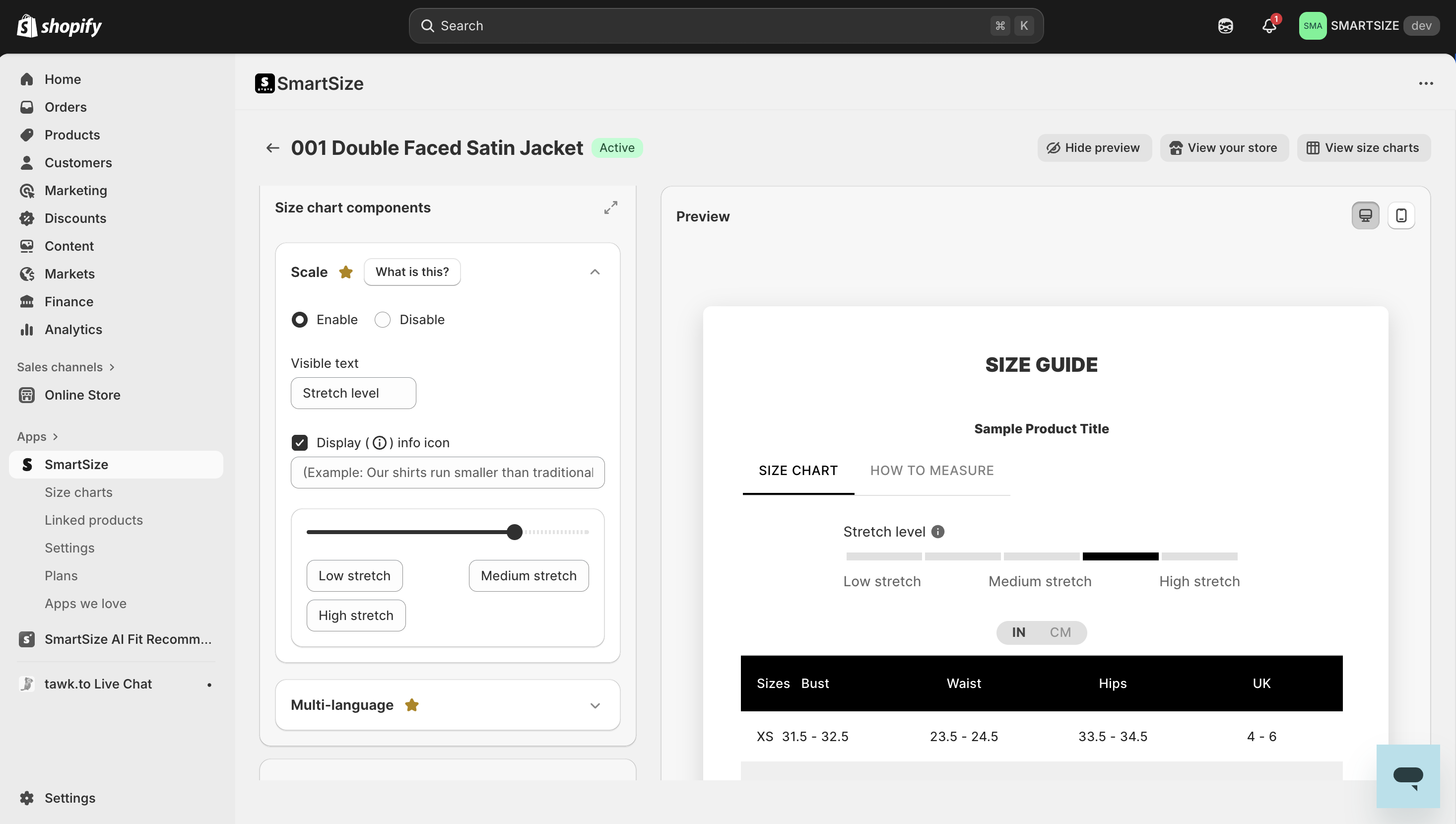 - In Shopify, go to Apps → SmartSize → Size charts and open a chart.