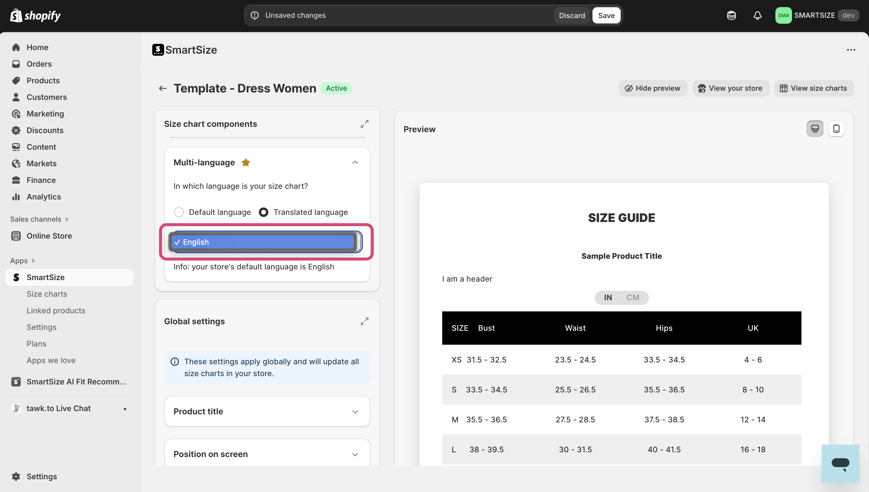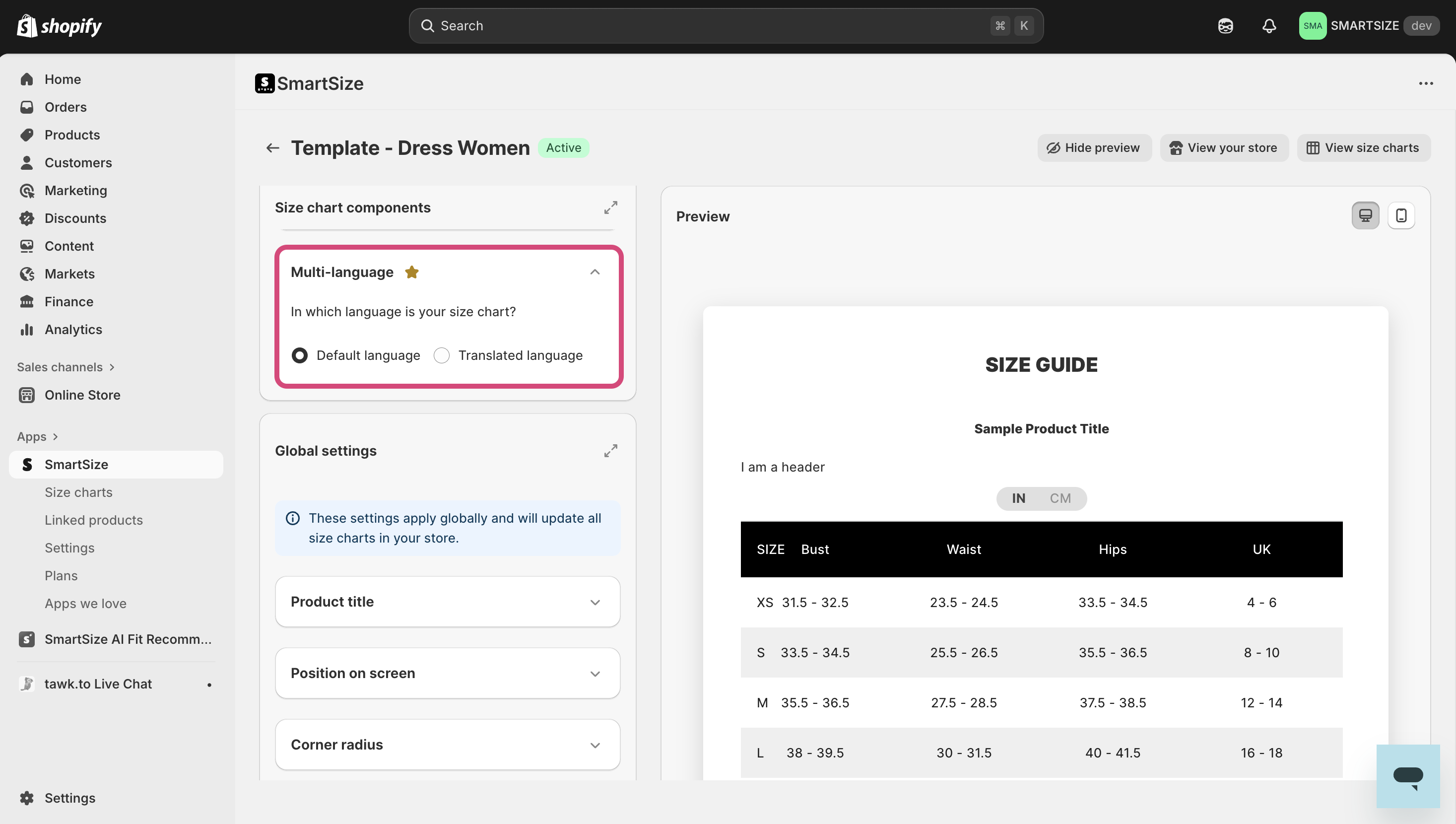 This guide explains how to set up multi-language size charts to provide a seamless shopping experience for international customers. When enabled, SmartSize automatically displays the appropriate size chart language based on your customer's store language selection.