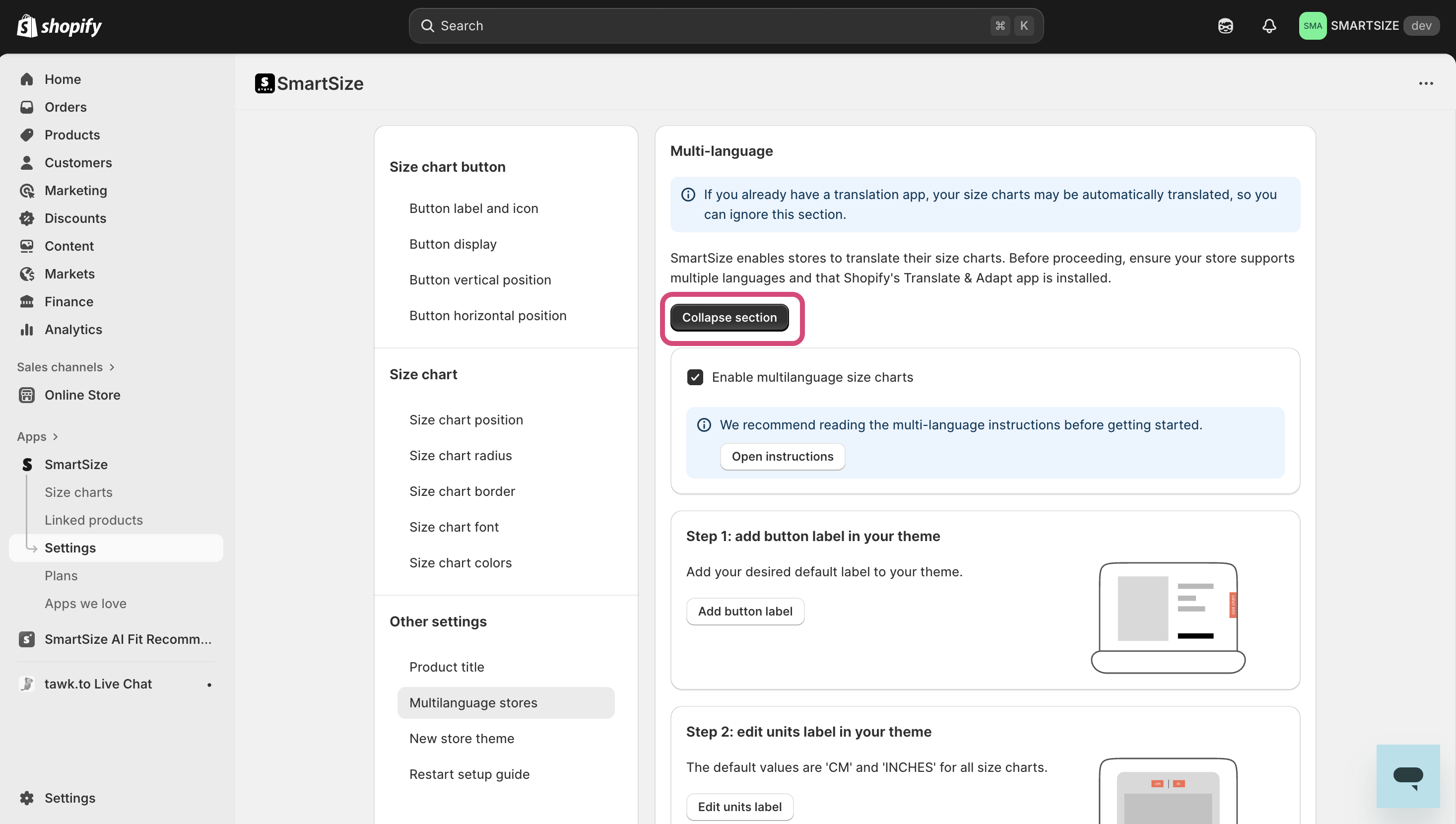 - Check the box labeled Enable multilanguage size charts to activate this feature.