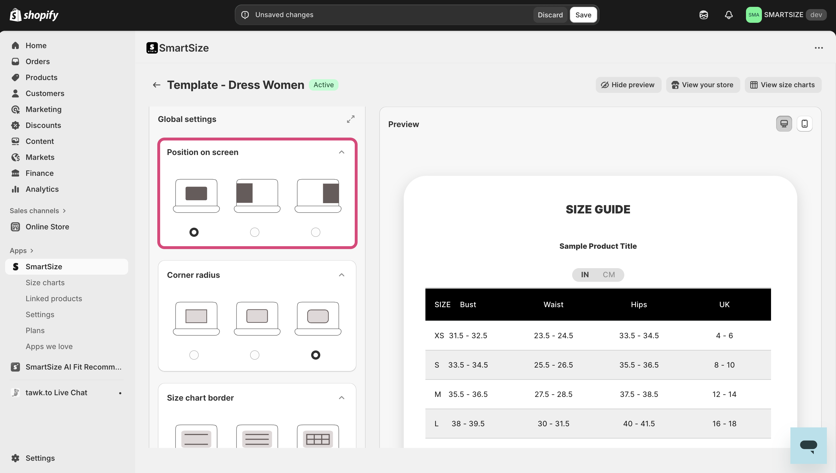 The position on screen setting defines where the size chart modal appears when customers open it. This allows you to adjust the chart’s placement for the best customer experience and alignment with your store’s theme.