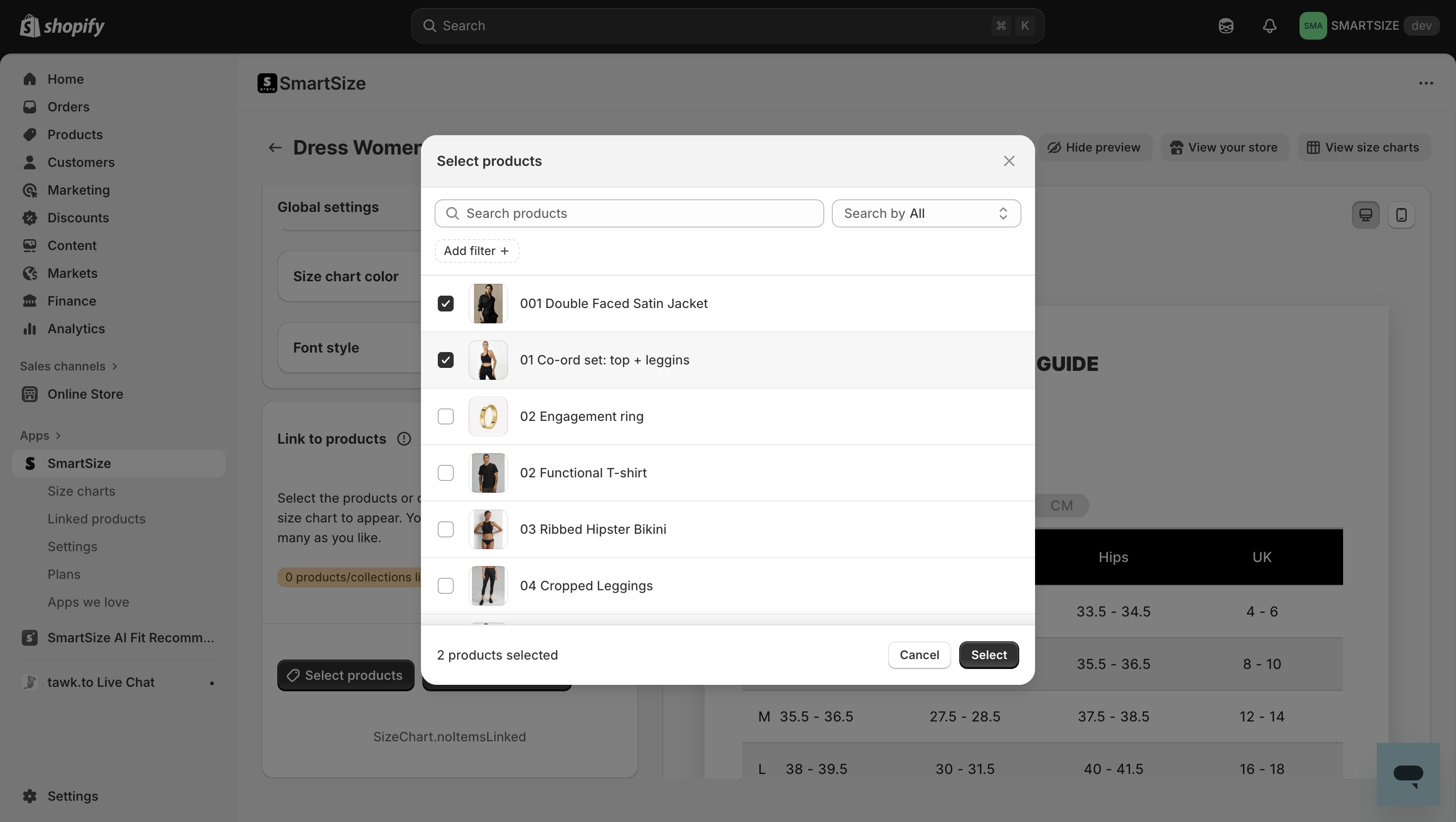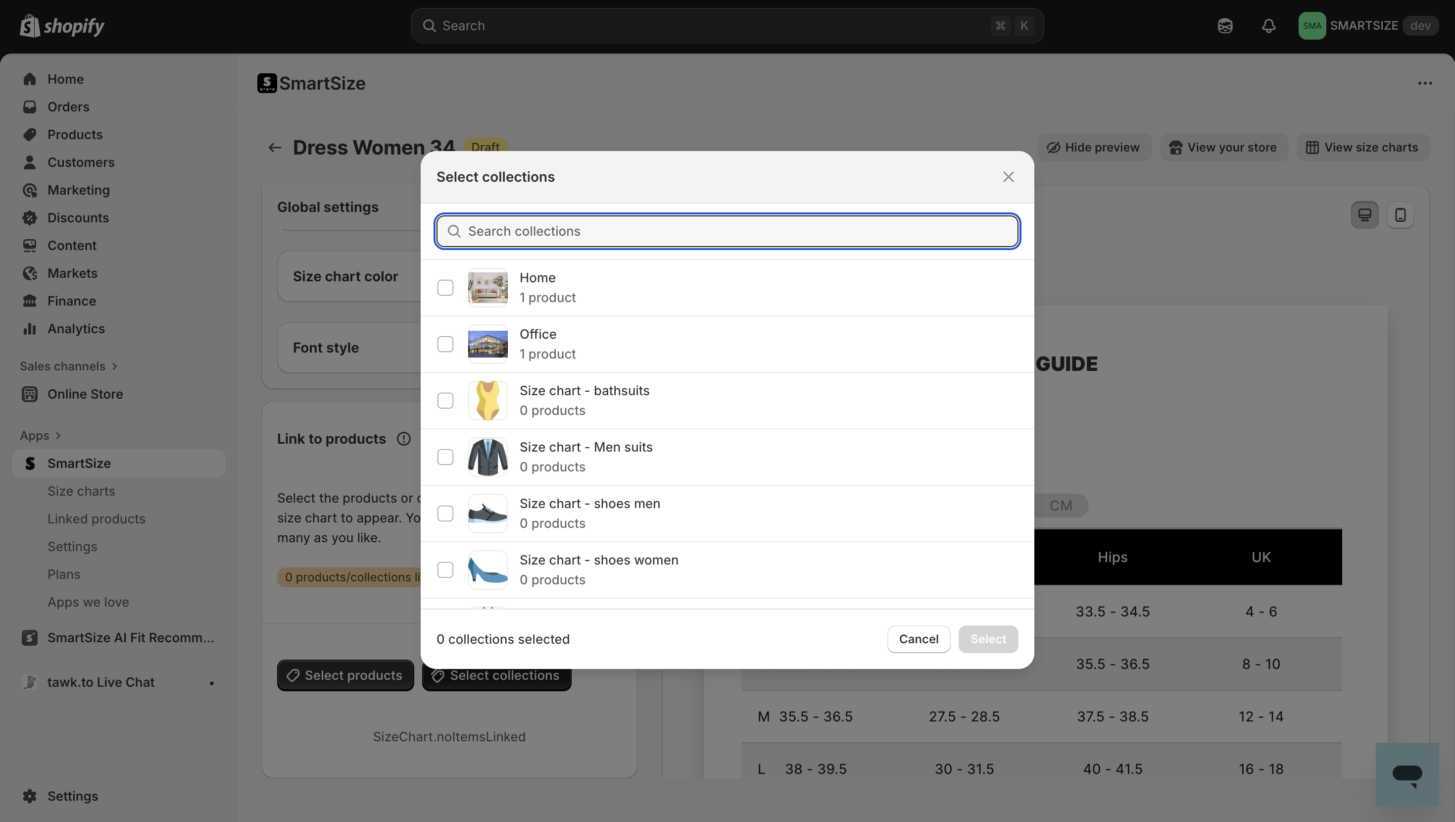 - In Shopify admin, go to Apps → SmartSize → Size charts.