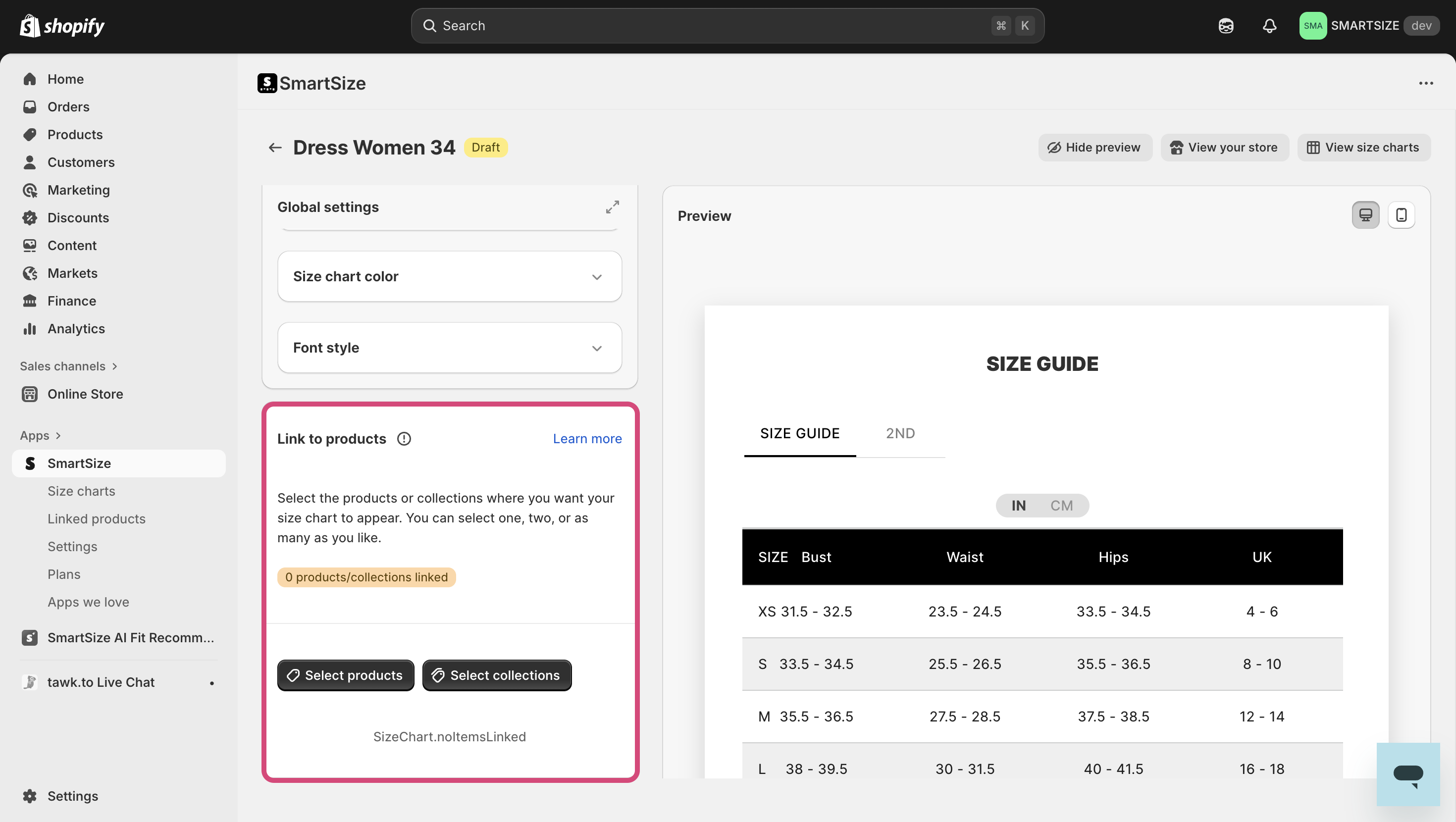 Linking a size chart to products or collections ensures shoppers see the right chart when browsing your store. You can link a chart to one or multiple products and/or one or multiple collections.