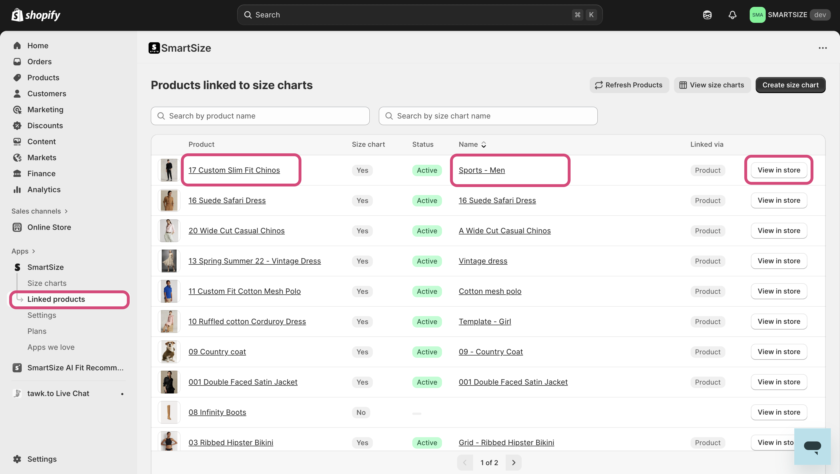 In 'Linked products' page (found on the left side menu, you will see all your products and to which size chart they are linked. Use the View in store button to quickly check how the chart appears on your storefront.