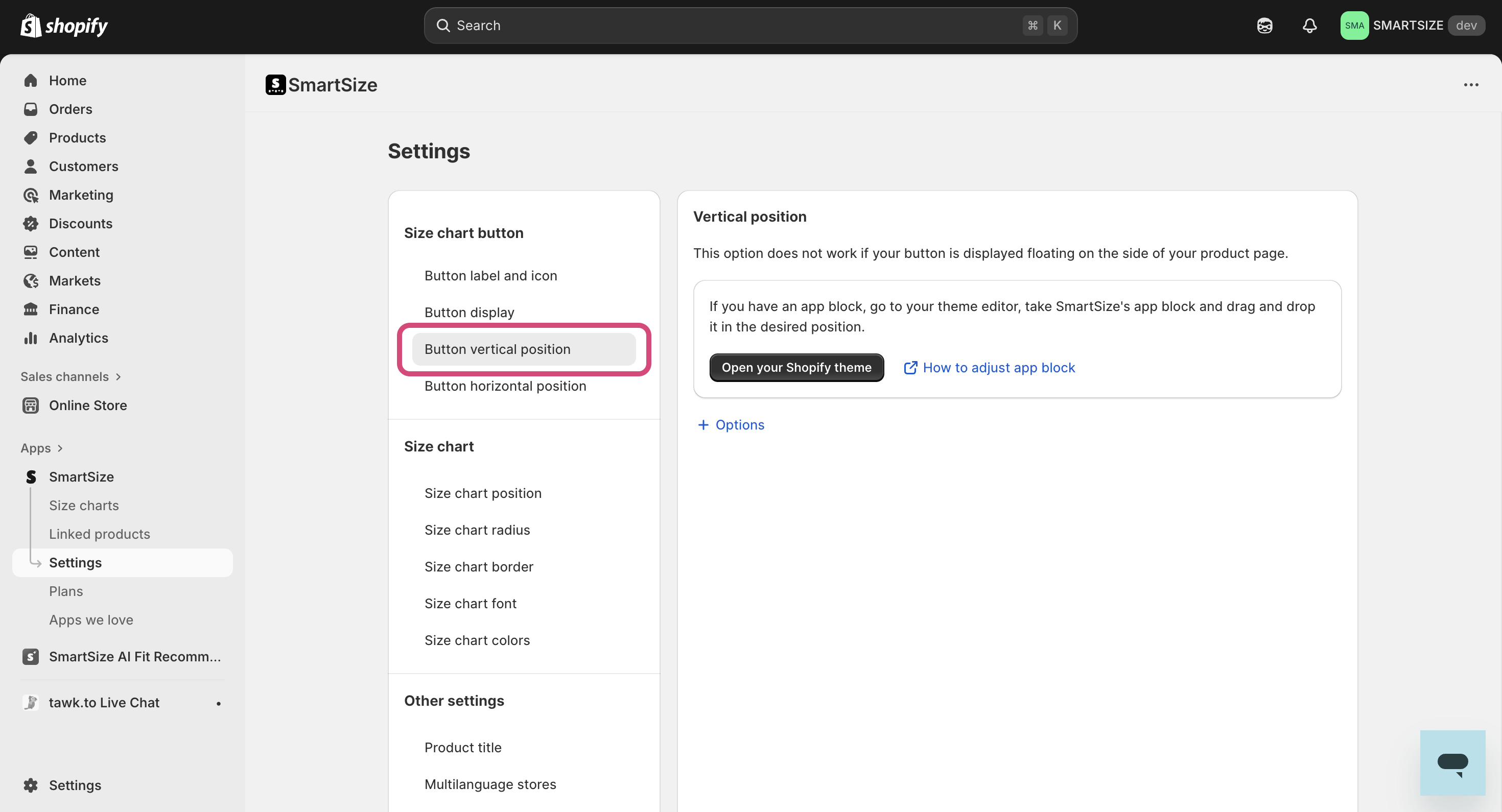 Select Button vertical position under the Size chart button section. This will automatically open your theme editor in the right location