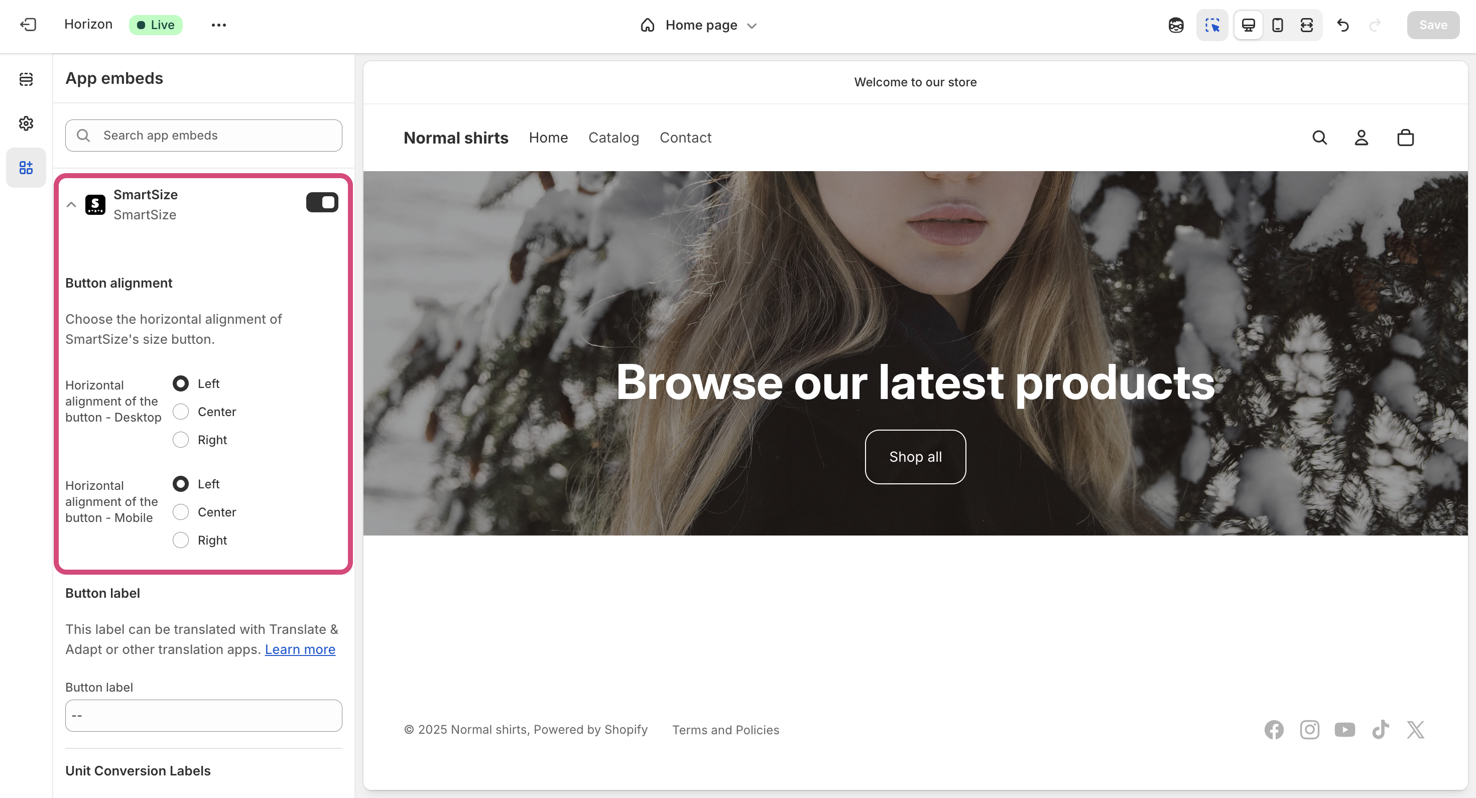 You can align the SmartSize button to the left, center, or right of your product page to better fit your store’s layout and design.