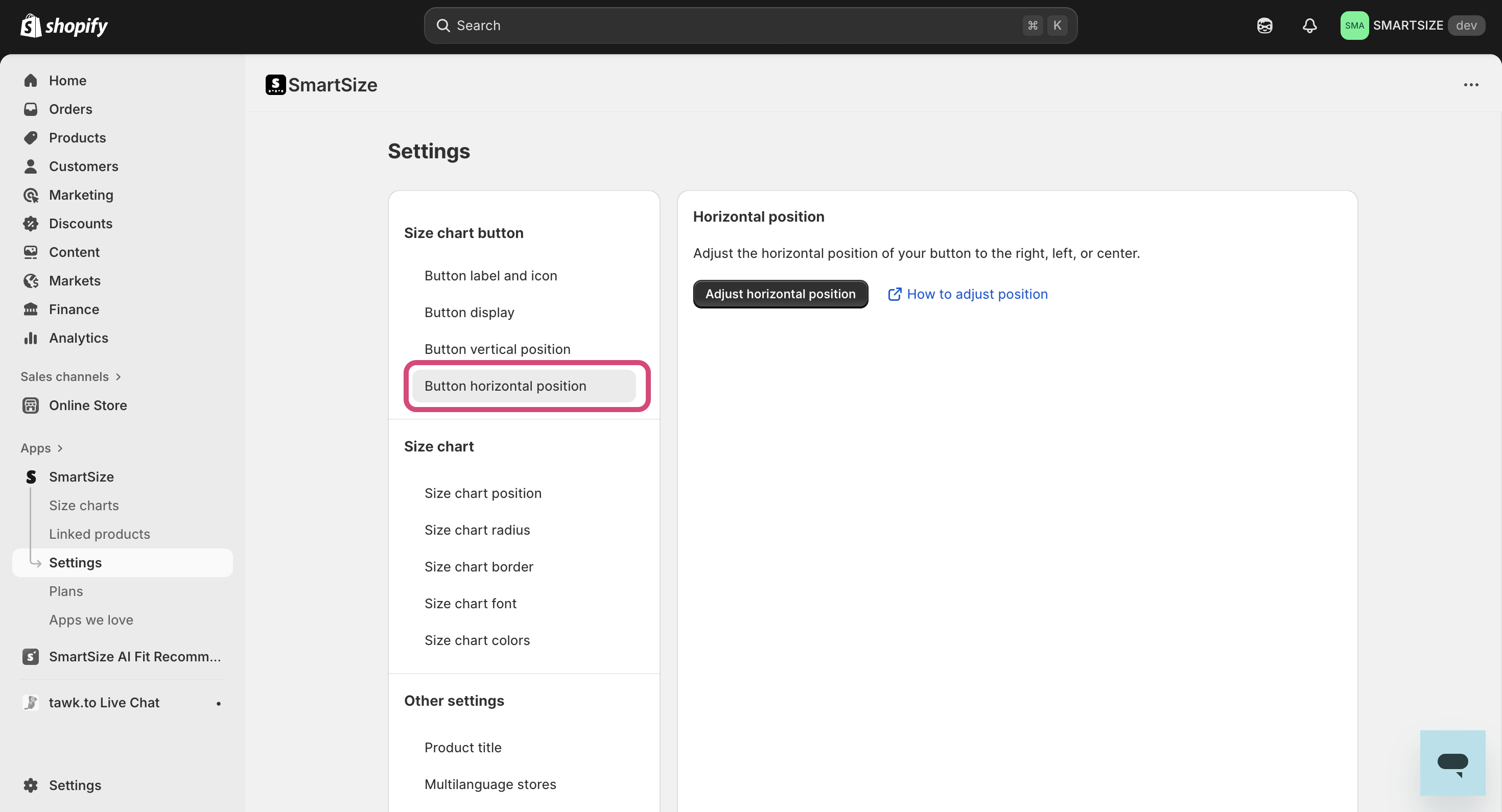Select Button horizontal position under the Size chart button section. This will automatically open your theme editor in the right location