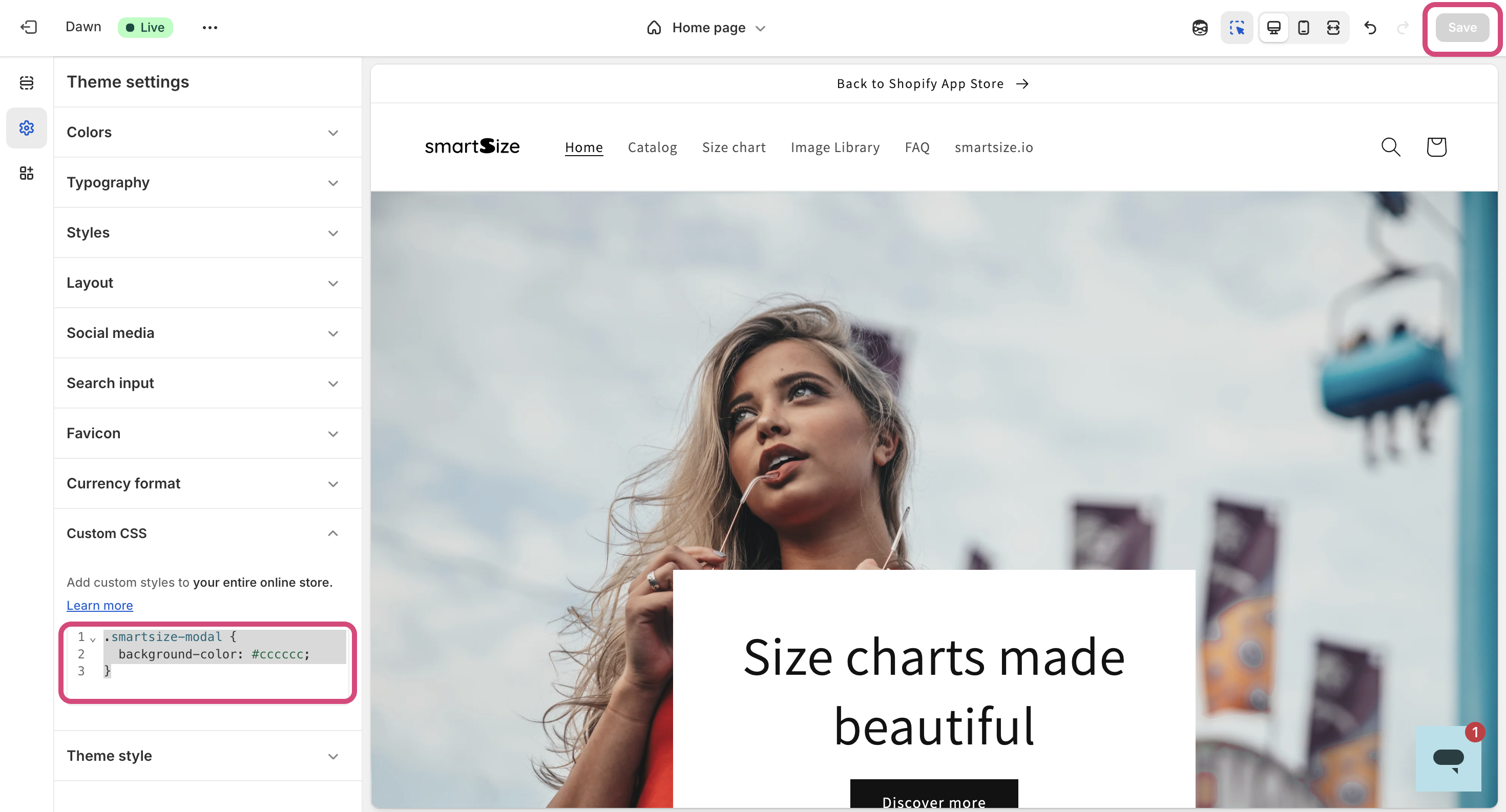 \Want to tailor the look and feel of the SmartSize popup to match your brand in a more advanced manner? You can do that by adding custom CSS styles directly in your Shopify theme settings — no need to touch your theme code.