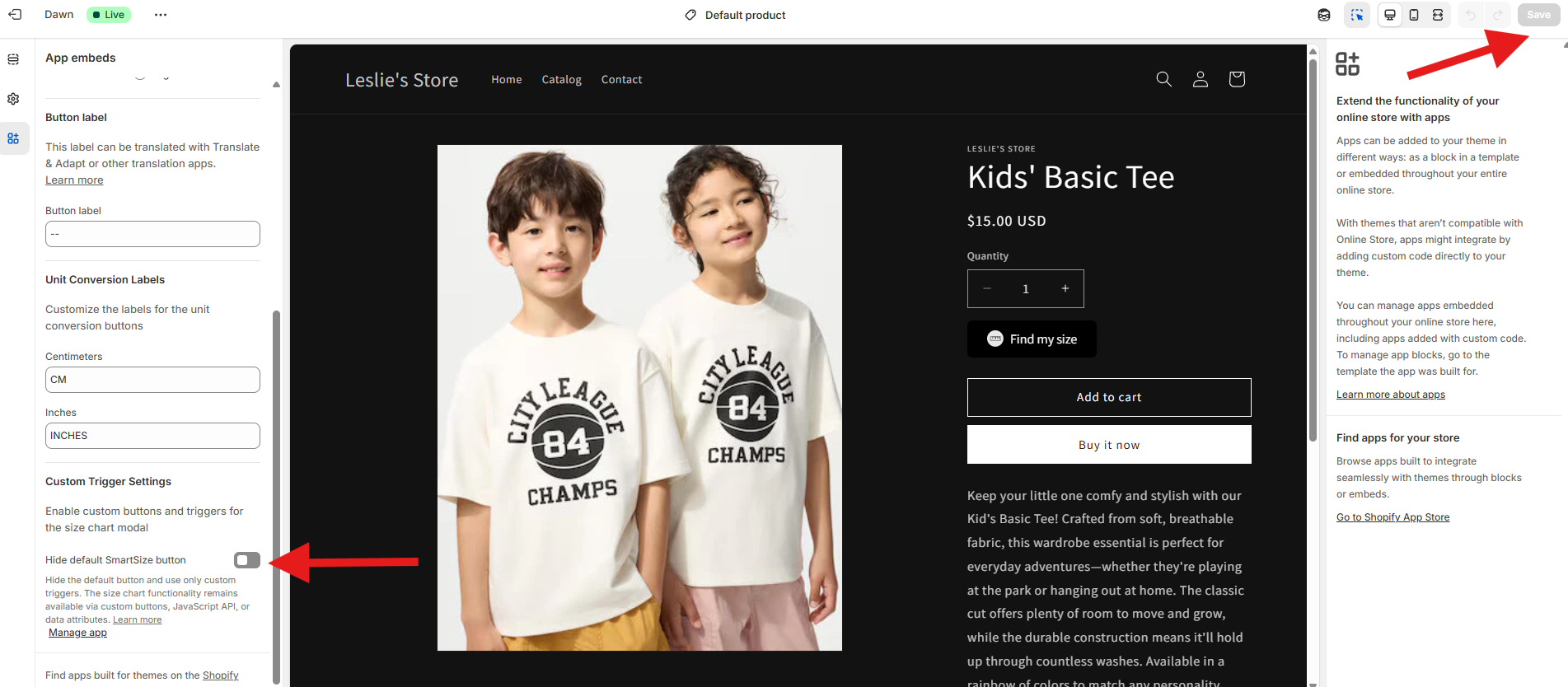 Once you've checked if the app embed is turned on, open the SmartSize app embed settings (˅) and scroll down to check if the Hide default SmartSize button is turned off.