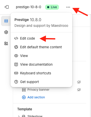 In the Theme Editor, click ... → </> Edit code on the top left corner: