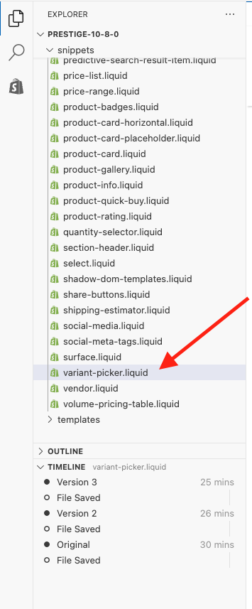 3. On the code editor, select this file on the file explorer on the left: snippets/variant-picker.liquid